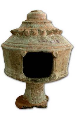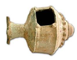 | Description / विवरण | Red ware lamp stand with circular head and square opening at the centre, decorated with pilaster motifs on either side, above the head is a stepped sikhara type of moulding depicted with full blown lotus, followed by deep grooves, above it is a knob with an outlet for smoke. |