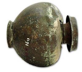 | Description / विवरण | Copper vessel in poorna kalasa shape with globular body and flat base, constricted neck with splayed out rim. |