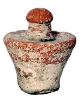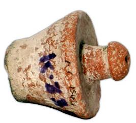 | Description / विवरण | Broken red ware lid with handle topped by domical knob with a perforation and a hole at the flat bottom. |