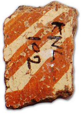 | Description / विवरण | Fragment of red ware pot painted with white pigment drawn in thick broad slanting lines. |
