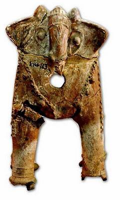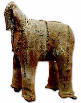 | Description / विवरण | Four legged elephant shaped sarcophagus in red ware, with circular opening below the trunk and also at the hind portion, it shows prominent elephant head with head gear and trunk broken, extended ear lobes, protruding eye balls, it is decorated with a chain of hanging bells at the neck, hind legs, front legs and body. |