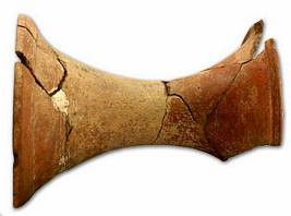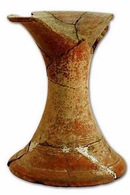 | Description / विवरण | Broken red ware stand with straight body and everted thickened rims on either side, multiple concentric circles at the bottom and deep groove below the rim at the top. |