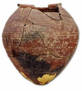 | Description / विवरण | Broken red ware pyriform shaped urn pot with thick splayed out rim, pointed base, a pair of chevourn designs on the shoulder and the body, multiple grooves below the neck. |