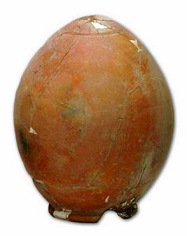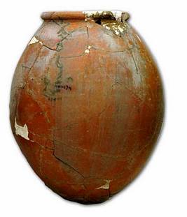 | Description / विवरण | Oval Cucumber shaped red ware urn pot with sagger base and constricted neck, splayed out thick rim, concentric grooves below the neck. |