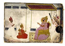 | Description / विवरण | Raja seated on a royal chair under a canopy giving instructions to seated and standing persons, behind him there are three standing soldiers. |