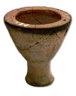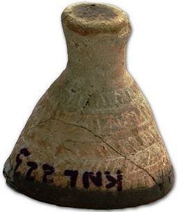 | Description / विवरण | Red ware lid with flat top and circular hollow bottom, externally decorated with hanging bells, chevourns, criss cross triangulars and hanging bell designs from bottom to top. |