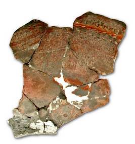 | Description / विवरण | Broken piece of a red ware pot with chevourn design on the body, below it is a rope design. |