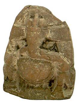 | Description / विवरण | Seated Ganesa with prominent horizontally elongated ear lobes decorated with designs, simple head gear. |