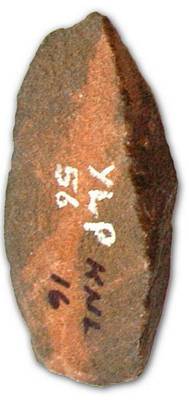 | Description / विवरण | Pen Knife blade made on thick flake with thick margin on one side and sharp margin on the other, flake scars on the ventral side, pointed functional edge, the distal end carved by retouch, a brown coloured vein is seen prominently on the dorsal side. |