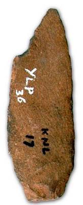 | Description / विवरण | Pen knife blade made on thick long flake with medial flake scar on the dorsal side and thin sharp edges on the lateral sides. The pointed edge on the top portion of the tool is created by retouching so as to use as a borer. It has flat butt end with bulb of percussion on the ventral side. |