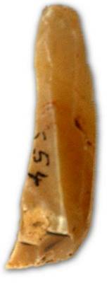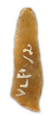 | Description / विवरण | Untouched flake blade with tapering top end, snapped bulbous end, thick medial ridge, chip marks at the distal end. |