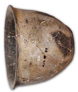| Description / विवरण | Polished Chalcolithic grey ware deep bowl with flat base and convex shoulder, slightly thickened averted rim, application of fine slip, black patches on the body. |