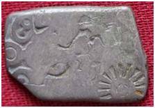 | Description / विवरण | The coin is an imperial type Punch- marked coin. The shape of the coin is irregular. Obverse Sun, six armed wheel and indistinct symbols. Reverse Indistinct symbol. |