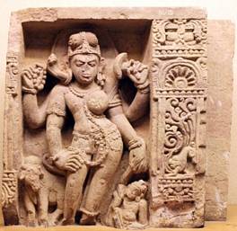 | Description / विवरण | The four armed Ardhanariswara is standing in tvibhanga pose. A plain halo is depicted on the back. The deity is adorned with Yajnopavita, earrings, necklace, gridle, wristlets, armlets and anklets. The deity holds a japamala on upper right hand and the lower hand is placed on thigh. The upper and lower left hands are hold a flower and the folds of sari respectively. Nandi bull is stand on the right and a male attendant seated on the left of the image. The limbs, clothes, ornaments and attributes of this image are in accordance with those of Parvati and Shiva on left and right sides respectively. |