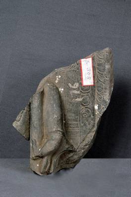 | Description / विवरण | Fragment of an iconic sculpture depicted on a stele. Hand holding an attribute. |