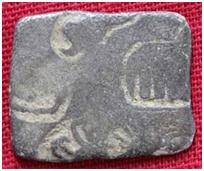 | Description / विवरण | The shape of the coin is rectangular. Obverse Sun, an elephant, six armed chakra and two symbols are not identified. Reverse Taurin, tree, which later on its shown by the dot only, with crescent line below and other three symbols are not identified. |