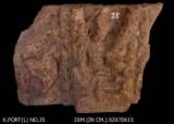 | Description / विवरण | A mutilated figure of Uma-Maheshwara seated in lalitasana on high couch and goddess Uma is seated on his left thigh looking his master. Siva is four armed but not clear only a right upper hand is clear, holding trident. The figure is flanked by dwarf acolytes on either side and a broken dancing figure is shown on the right of panel. The mukuta of Siva is broken vertically. |