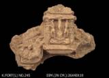 | Description / विवरण | Uppar part of the parikara of a sculpture, only torana part showing four armed seated image of Surya in a niche, holding lotus buds in upper hands. The fish and tortoise incarnation of Vishnu on the left and right side respectively and a torso of flying vidyadhara below fish. |