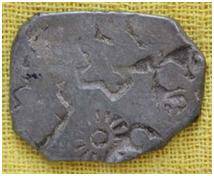 | Description / विवरण | The shape of the coin is irregular. Obverse Humped bull, tree, Sun and six armed wheel. Reverse Circle flanked by two taurines, dot within a circle and an indistinct symbol. |