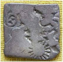 | Description / विवरण | The shape of the coin is pentagonal. Obverse Sun, three animal figures, six armed wheel. Reverse Symbols are indistinct due to abrasion. |