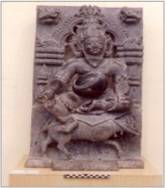 | Description / विवरण | The sculpture of Agni , the fire god is seated in lalitasana on his mount ram holding a rosary in his right hand resting on his knee while his eft arm is broken at the elbow. He is beaded and has pot-belly. He is flanked on the back slab, by two vessels of fire on each side, one paced above the other. He is framed by a trefoil arch with a Kirttimukha at the apex and makaras at the sides and a flying vidyadhar in each upper corner. |