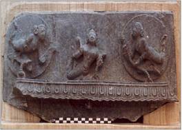 | Description / विवरण | The sculptural fragment depicts thre celestial flying vidyadharas holding garlands in their hands. . |