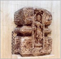 | Description / विवरण | The architectural fragment has three moulding joined together with a vertical band. The shallow niche of the vertical band is relieved with a skipping female figure holding an arch like object over his head both of hands. |
