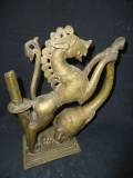 | Description / विवरण | Here in this image the lion is shown as holding the trunk of the elephant below it. The body of the elephant is not shown. Only the head of the elephant with its long trunk is shown. Behind the lion a post. This piece of metal art might have been some part of a lamp stand or some other object. The post is also a figure of lion supporting and carrying the weight of the sculptures. |