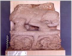 | Description / विवरण | The sculputural fragment depicting a crouching elephant on a pedestal. Though the mounting stylized lion is mutilated, traces of its paw is visible on the elephants back. |
