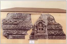 | Description / विवरण | The sculptural fragment are door lintels having five facets. The facets bear the following reliefs 1 foliated leaves within beaded border lower one 2 a row of flying vidyadhars. 3 foliated leaves. 4 double coil of a naga couple. 5 succession of triratnas. In the cetral part of the lintel is depicgted two-armed gajalaxmi seated in Lalitasana on a padmapitha. With her left hand she holds a stalk of lotus and keeps the right hand in Varada mudra. A pair of elephants pour water over her from jars held in their uplifted truncks. |
