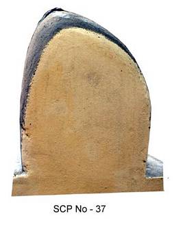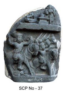 | Description / विवरण | The sculpture slab depicted two registers upper and lower. The upper one depicts a devotee headless seated cross legged in padmasana aspect infront of the Siva linga. Behind it is a female attendant standing. Below is a broad patta band . In the lower panel is a war scene depicting warriors seated on horse back and marching forward holding swords and reins of the horse. At the extreme end on the left side is probably the commander with beard. The horses are picturesquely shown in the act of galloping. The chief is well dressed with a full sleeved kurta like shirt tied by a thick belt across, over the left shoulder. The horses are well decorated with garland like haras around the neck. |