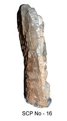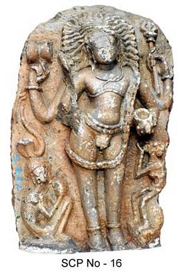 | Description / विवरण | Siva as kankala murti or bhikshatana murti. It is a standing image and nude devoid of any drapery. The head has jatas or locks of hair in dishevelled fashion spreading out fan-like on either side. It has four hands. The right rear hand holds the damaru, while the left rear holds the trident. The front right is broken while the front left holds the skull cap. There is lone tight kantamala in single strap falling on the chest. Below it, is a waist band and a long beaded yajnopavita across the left shoulder. Other ornaments include bangles and anklets. On the right side is a coiled serpent below which is a lean, seated male to the left. On the left side is lean woman standing and begging for nectar, with her palm opened at the mouth. |