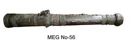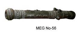 | Description / विवरण | Bronze Canon having multiple circular bands, custard apple shaped rear end, dragon shaped handles on the upper face, two thick lateral handles, a label inscription in French at the rear end. There are representation of leeches three in number swimming on the upper side. Also ornamental banded designs near the handle and functional areas. |