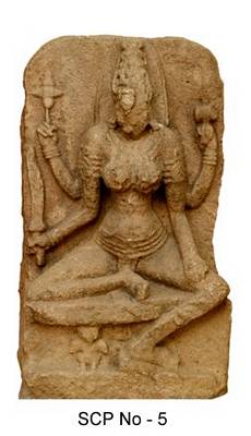 | Description / विवरण | Chamundi seated in lalitasana aspect with the right leg bent inwards and resting on the pitha with the foot open to the left, while the left leg is bent towards left and hangs down with the foot kept on the foot rest. The head is adorned with jata makuta with crescentic Moon on the front. The hair is knotted in conical shape with receding tiers one over the other. It is four handed. The right rear arm holds a conch, while the front right holds the sword. Similarly, the left rear hand holds the damaru where as the front left holds a cup. The face is abraded. The ornaments include necklaces, keyuras, and wristlets. There is a lower garment tied to the loin with four straps around the thigh with a central tassel. Underneath the pitha is a dwarf male with folded hands in anjali mudra. The image looks slim proportion with a fiery look. It seems to belong to the Chalukyan idiom in style. |
