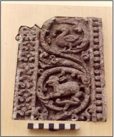 | Description / विवरण | The sculptural fragment is a creeper scroll depicting inside its circles a have and a duck. |