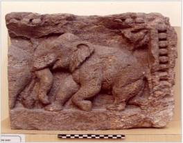 | Description / विवरण | The sculptural fragment within beaded borders depicts the marching of two elephants. |