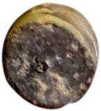 | Description / विवरण | A pulley shaped notched pendent or ear spool. It has solid straight body having slightly raised circular ends. The circular faces are decorated with pinched dots filled with white wash. |