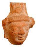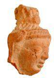 | Description / विवरण | Broken head of terracotta human figurine with oval face, long bulged snubbed nose, thick lower lip, and almond shaped eyes with slightly protruded eye balls. He wears thick beaded patta on the forehead with tassels on either side, combed hair made into top bun, which looks like a fan with a circular jewel pendent at the centre. |