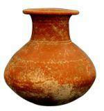 | Description / विवरण | A red ware pot with globular base, slightly carinated waist, sloppy shoulders, high neck with slightly everted externally thick flat rim. A pinched design on the shoulder. A pair of deep grooves at the base of neck and below the rim. Of medium fabric it is treated with fine red slip. Inverted v shaped grafftti on the shoulder. |