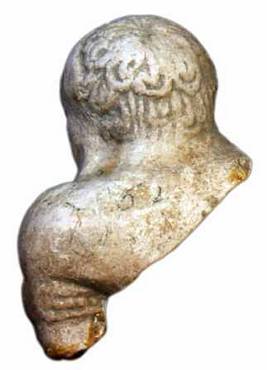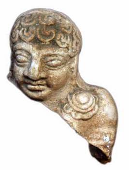 | Description / विवरण | Head of a human figurine made of Chinese clay, with elongated, snubbed nose, smiling face, hanging patra kundalas. The other is missing on the right . Keyura is seen on right hand partly seen. It shows half closed eyes, thick lips head cap decorated with a row of crescent designs, smiling face. |