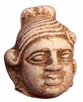 | Description / विवरण | Head of a human figurine made of Chinese clay with combed hair tied with a knot at the back side of the head. Hair tied with an ornament on both sides. The charming face shows long snubbed nose, open eyes, thick lips, multiple wavy hair bands, tied with a top knot and side tassels added beauty to the face. |