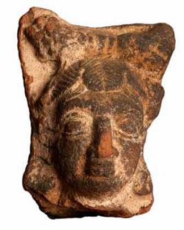 | Description / विवरण | Head of a human figurine with hair tied into a makarika ornament. It shows oval face with open eyes, thick lips, elongated nose, kundalas. It shows combed hair on the ventral side. |