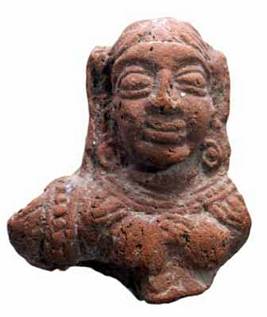 | Description / विवरण | A broken head of female terracotta figurine with bulging eyes and elongated flattened nose. She wears patra kundalas, a necklace with leaf design and a beaded keyura on the shoulder is seen on one side. She is shown with open eyes and thick lips. |
