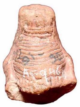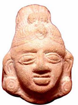 | Description / विवरण | Head of a terracotta female figurine, with smiling face, long flattened nose, lower lip is seen slightly heavy, bulging eyes. Combed hair is shown like a fan and drawn upside, tied with a knot, a prominent jewel hanging down on the forehead, suspended from the tied up hair upasa , a beaded band seen on the back side. |