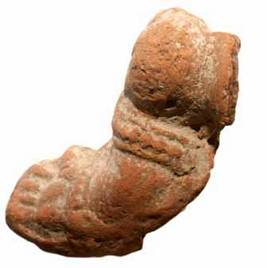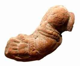 | Description / विवरण | A broken right hand of terracotta human figure with a beaded keyura and wrist band. |