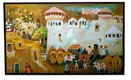 | Description / विवरण | The painting shows palaces and poor men houses, people are going on bullock carts to a fair. |
