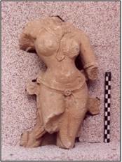 | Description / विवरण | The sculptural fragment depicts the female figure in a graceful standing tribhanga pose. She wears necklaces with the lower one lopping between her breasts. She has a bejeweled girdle. Other attributes have been badly mutilated. |