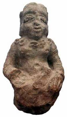 | Description / विवरण | A terracotta male figure seated in ease, keeping both his hands on the knees with open and extended fingers. The right palm broken. Navel and nipple parts are pinched. He wears a hara decorated with a chain of circular pellets. He has oval face wide eyes with projected eye balls, slightly snubbed broad nose, fleshy cheeks, mouth slightly open with wavy lips and broad ear lobes with kundalas. He wears armlets and wristlets. A thick, broad head band and combed hair arranged like a short jatamakuta. |