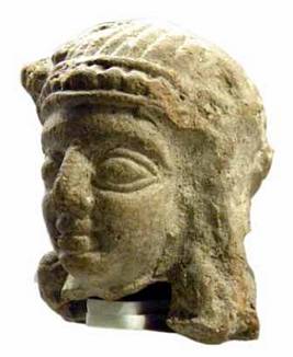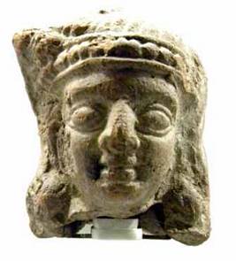 | Description / विवरण | Head of terracotta figurine with oval face, protruded eyes, long broad slightly snubbed nose, and thick lips. He wears patrakundas, head band with beaded chain in between two plain bands, combed hair drawn to a side and made a side bun. |