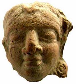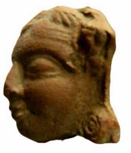 | Description / विवरण | Head of terracotta human figure with long, broad slightly flattened nose, thick lips, diamond shaped eyes, fleshy cheeks and circular patrakundalas, the right ear is broken . It shows a thick head band with a central circular decoration abraded , slightly worn out figure. |